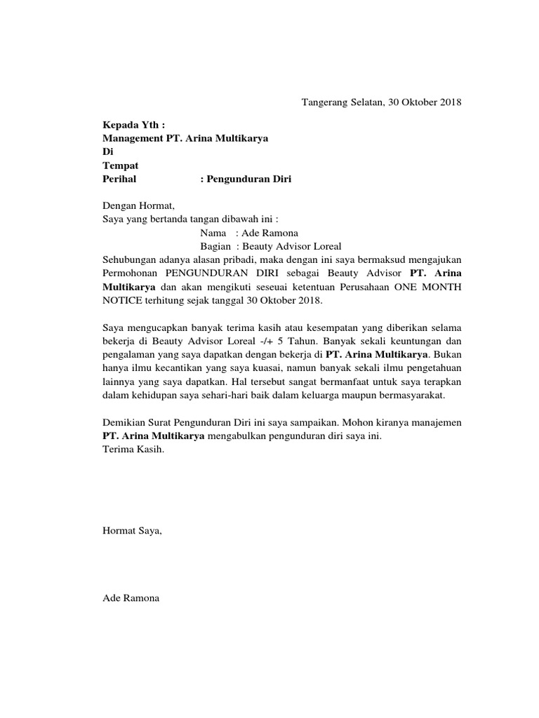 15 Contoh Surat Resign Pengunduran Diri Kerja Yang Baik. Sesuai namanya one month notice berarti adanya pemberitahuan satu bulan sebelum kamu resmi mengundurkan diri dari tempatmu bekerja. Contoh Surat Pengunduran Diri Sederhana.