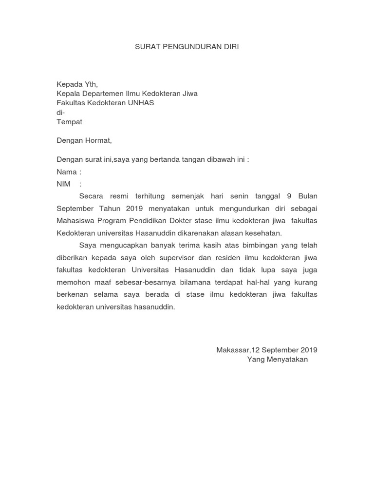 Surat pengunduran diri unhas. Pengunduran diri dari seluruh matakuliah bagi mahasiswa penerima beasiswa wajib mendapatkan persetujuan dari institusi pemberi beasiswa. Surat Pengunduran Diri adalah pernyataan formal dari pekerja yang ingin meninggalkan pekerjaannya. Prosedur Usul Pengunduran Diri dari Kegiatan Akademik Dosen PA Ka Lab.