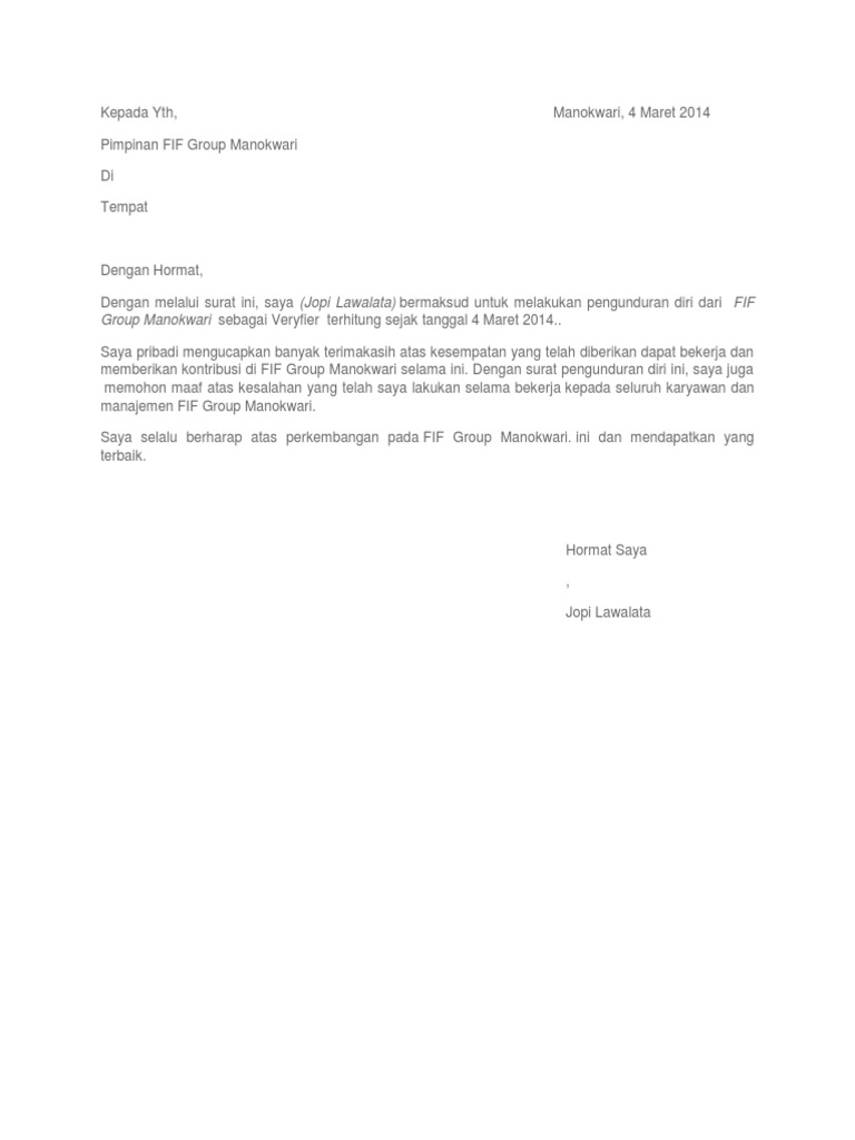 Surat pengunduran diri fifgroup. Atas perhatiannya saya mengucapkan terima kasih. Kepada Yth HRD PT. Berisi informasi yang mencakup nama orang jabatan terakhir tanggal surat pemberitahuan tentang kapan hari terakhir bekerja ucapan terima kasih dan tanda tangan.